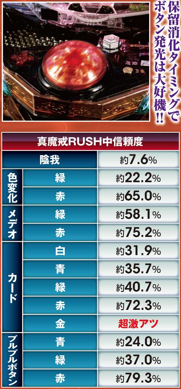 心滅RUSH中は今作から新たに「横回転」が加わり赤なら信頼度66%。真魔戒RUSHでは「メテオ」と「カード」の2保留が新搭載され、後者はストックが発生すれば好機だ。