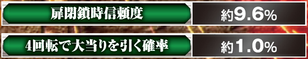 | 確変突入率 | 53%/161回転まで(ヘソ) 100%/161回転まで(電チュー) |