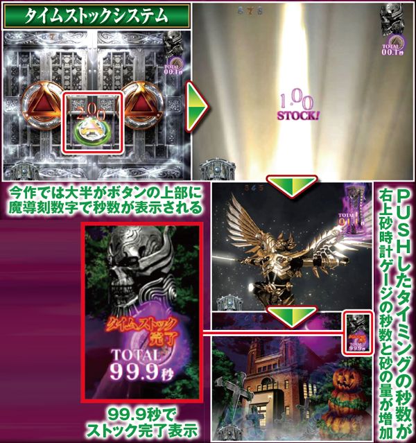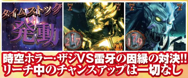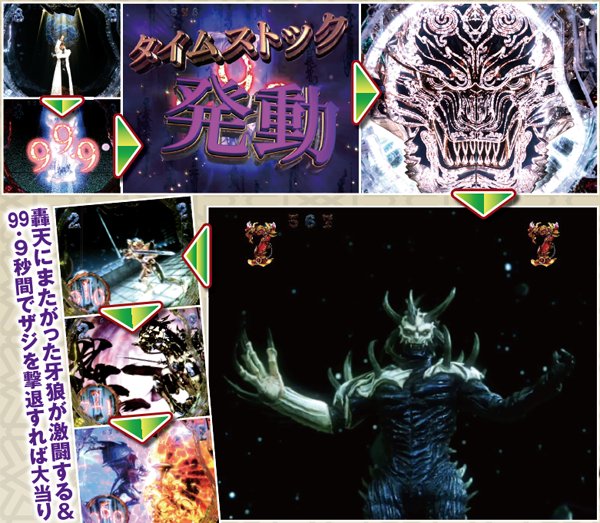 通常時に発生するタイムストック演出で、累計99.9秒貯まった状況下(液晶右上で確認可能)でのみ発展する可能性がある特殊リーチ。牙狼を執拗に追いかける時空ホラー・ザジを99.9秒以内に撃破できれば大当りとなる。