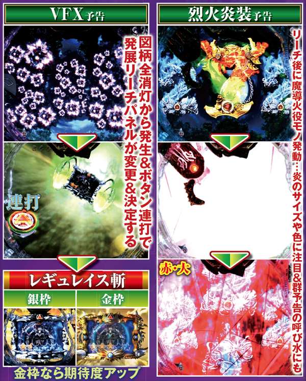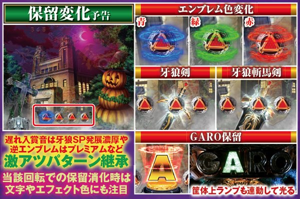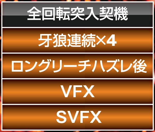 牙狼シリーズの長い歴史を経て培った深みのある通常時定番演出は今作でも概ね健在、かつ役割もこれまで同等となっているため、アツい予告の期待度知識が今作でも流用可能だ。なお『FINAL』に搭載されていたVFX予告の上位パターン、SVFXが今作で見事復活を果たしている模様。