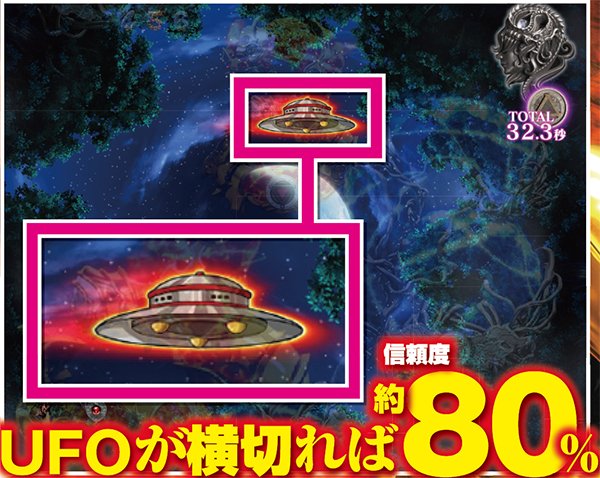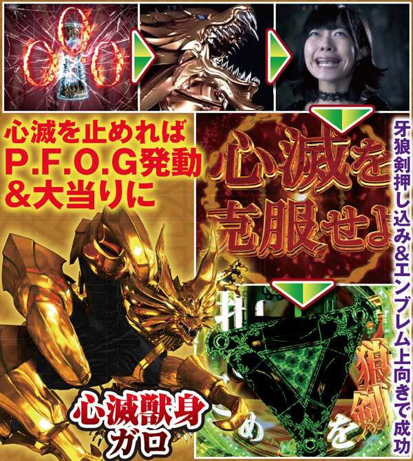 図柄テンパイ後に突如「プチュンッ」と液晶がブラックアウトしカウントダウンが始まれば、カウント「0」到達後の牙狼剣役モノPUSHでP.F.O.G完成が約束される新規激アツ予告だ。