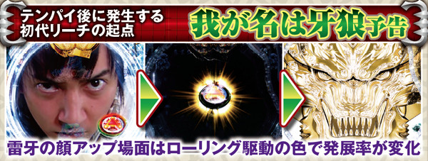 テンパイ後の「我が名は牙狼予告」からのみ発展の可能性を含む。初代シリーズの4リーチを完全再現した描写となっており、初代リーチに限ってはチャンスアップポイントとなるタイトル画面も初代を再現。ローリング駆動も作動しない。当然、激アツリーチとして名をはせた「初代魔界竜」が最強となる。