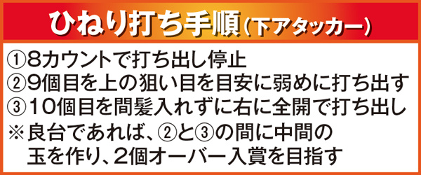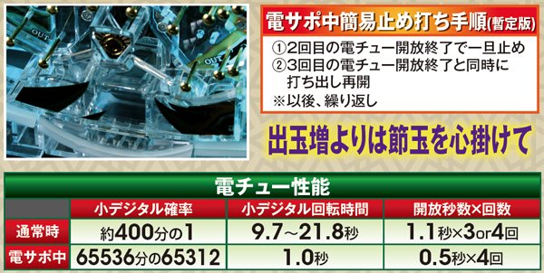 今作でも電サポ中の電チュー開放は1パターンのみ&3個賞球と、打ち手に嬉しい設計となっている。しかし、小デジタル回転が頻繁に枯れてしまっては作り手側の親切心も水の泡。スルーが厳しい場合は節玉的な意味合いが強い止め打ちを心がけよう。