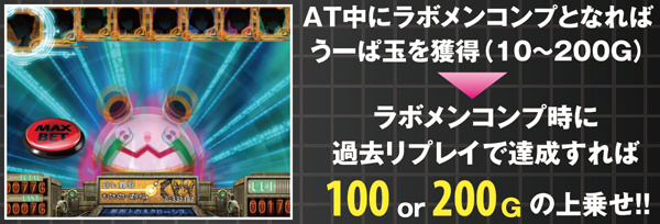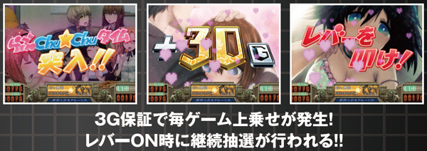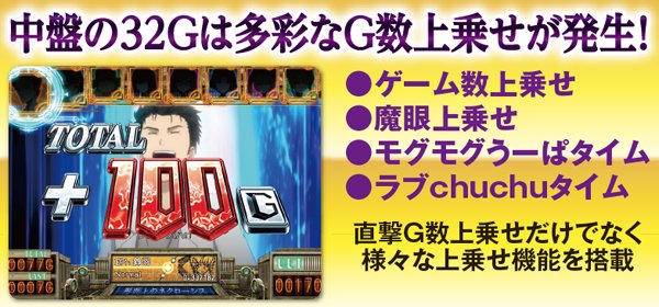 チャンス役成立時は10~200Gの直撃上乗せ抽選が行われ、ゲーム数上乗せ後は停止ボタントリガーによる3回の上乗せが見込める魔眼上乗せ突入のチャンス。直撃上乗せのほかに、上乗せ告知が最終ゲームに回される裏乗せも存在する。また、AT中のラボメンコンプでうーぱ玉をストックすれば、5個ストックor中盤パートの最終ゲームでモグモグうーぱタイム突入となり上乗せが発生。上乗せゲーム数はうーぱ玉の色によって示唆される。さらに、AT中にBAR揃いが発生すれば、継続型上乗せ特化ゾーン「らぶchuchuタイム」に突入。継続する限り10~200G上乗せ発生と大量上乗せに期待できる。