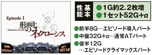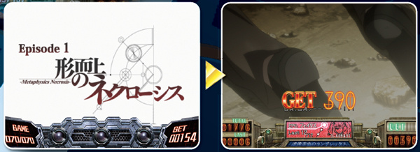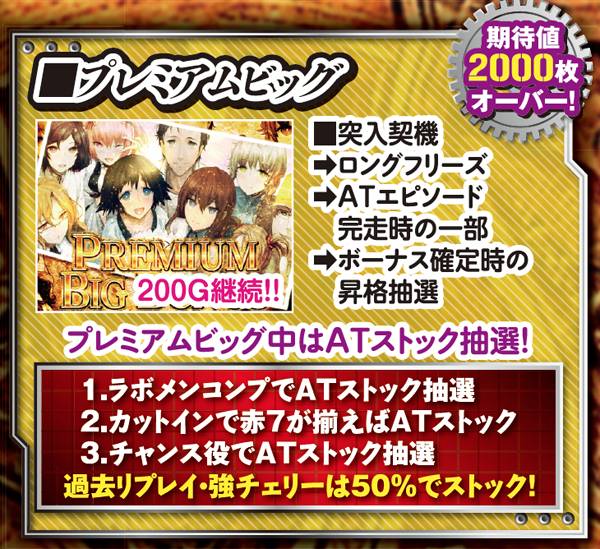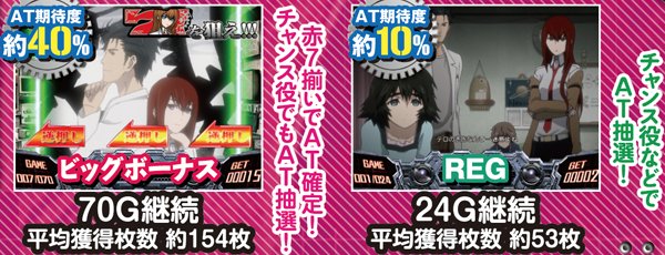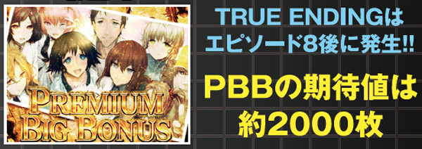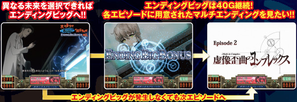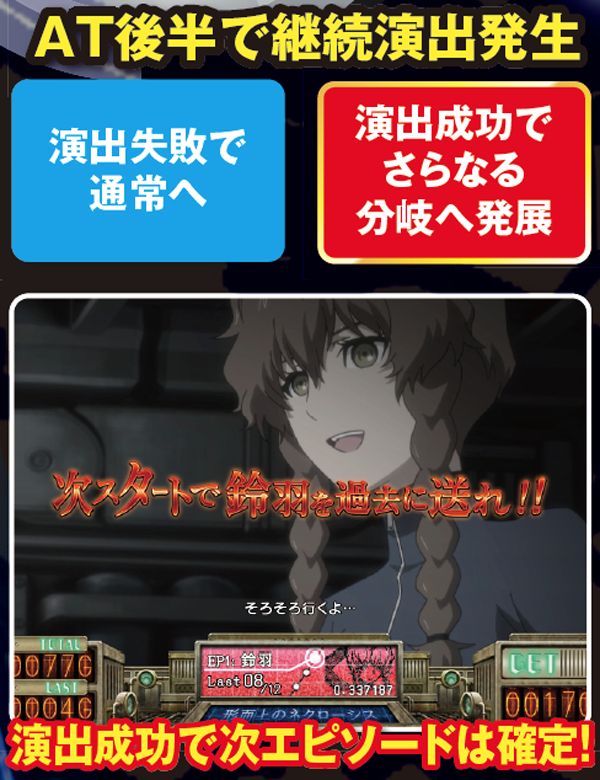 AT後半12Gで発生する演出成功で次エピソード突入(AT継続)が確定となるが、確定後にも分岐が存在。異なる未来を選択できれば40G継続のエンディングビッグ当選となり、キャラ毎に用意されたパチスロだけの新規アニメーションを見ることができる。