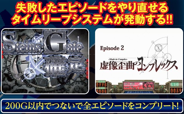 『パチスロシュタインズ・ゲート』は、ただのタイアップ機ではなく、ゲームやアニメ同様に正式シリーズとして作られた大注目のマシンである。 出玉増加のカギを握るのは、純増約2.2枚のAT「シュタインズ・ゲート」。1セットは52G+α継続となっており、セット毎にエピソードが展開していく。また、ラボメンコンプ・タイムリープシステム・マルチエンディングと銘打たれた三大機能を搭載。 |