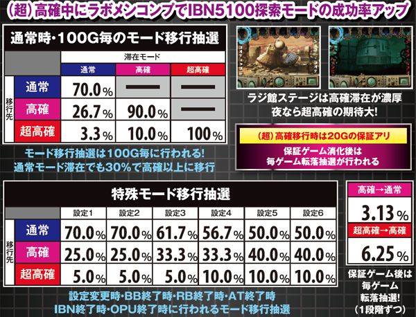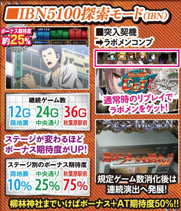 通常時は3種類のモードがあり、高確や超高確滞在時にラボメンをコンプするとIBN5100探索モードでの当選率がアップする特徴がある。100G毎に昇格抽選が行われ、高確以上に移行すれば20G継続は保証される。