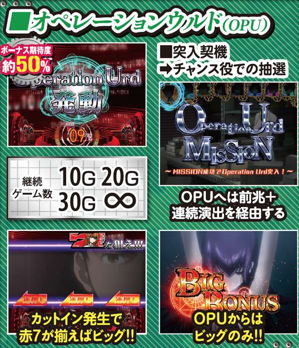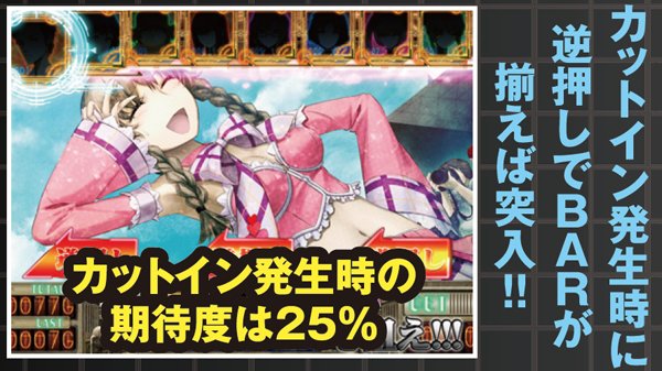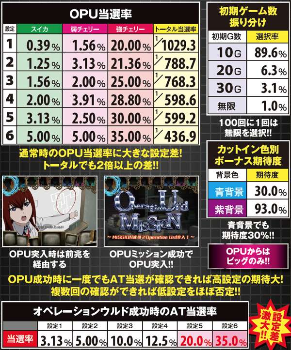 OPU当選率には大きな設定差が存在。スイカからの当選を一度でも確認できれば高設定期待度が大幅にアップする。なお、消化中はカットインの色に注目。紫背景が発生すれば赤7揃い期待度激高だ。
