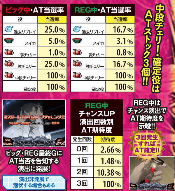 ビッグ中・REG中ともにチャンス役でAT抽選。中段チェリーor確定役成立なら問答無用でAT当選となる。なお、REG中はチャンスUP演出の回数によってAT期待度を示唆。3回発生ならAT確定だ。