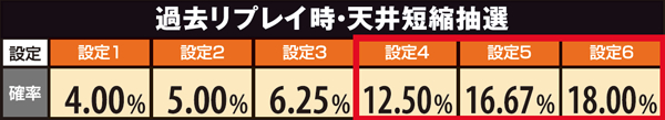 本機の天井はIBN5100探索モードを19回スルーすると20回目の突入で必ず成功となる。ただし、過去リプレイ成立時に天井短縮抽選が行われ、当選すれば次回IBN5100探索モードでの成功が確定。結果的に高設定ほど大ハマリしにくくなるというわけだ。