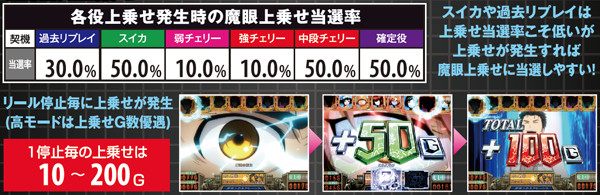 直乗せ時はリール停止毎に上乗せとなる「魔眼乗せ」の抽選も行われるため、直後の演出に注目したい。
