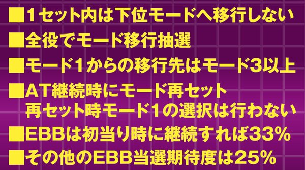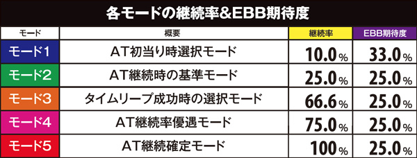 AT中は5つのモードにより、継続率とEBBの当選率が変化。初回セットはストックがない限りほぼ継続率10%が選択されるため、タイムリープでの引き戻しが出玉の鍵を握る。