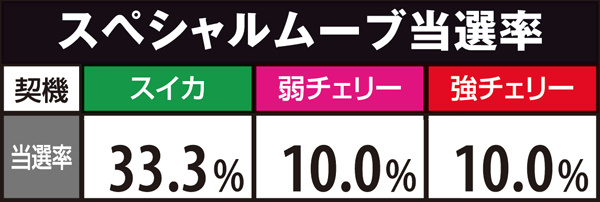 通常時に成立したチャンス役はOPUの他にスペシャルムーブの突入抽選が行われ、当選すれば5G間に渡りラボメンをコンプしやすい状態へと移行する。スイカは3回に1回でスペシャルムーブへと突入するため、次ゲームは液晶画面に注目。消化中はリプレイ成立で、まだ獲得していないラボメンゲットとなる。