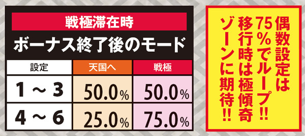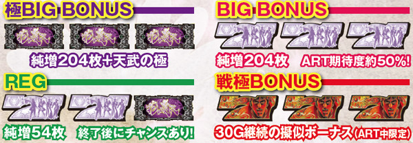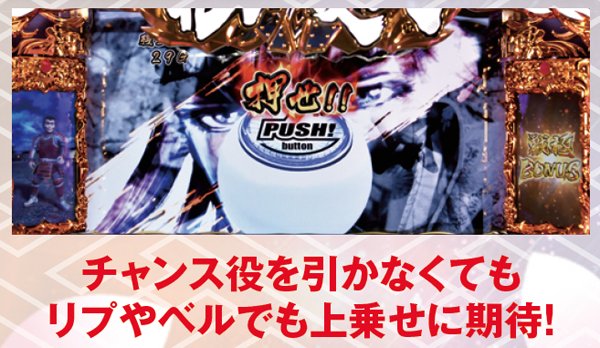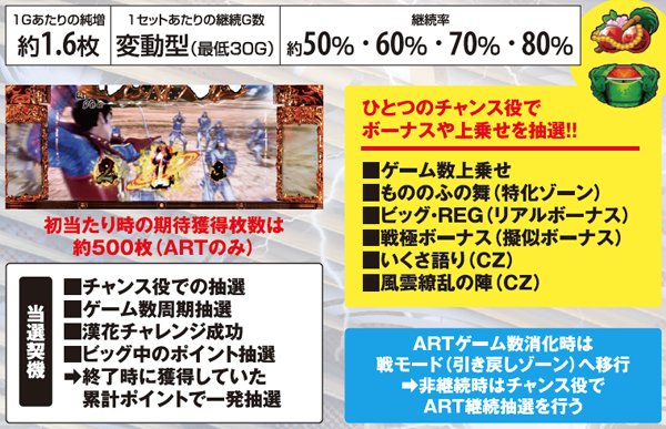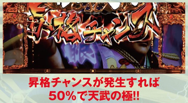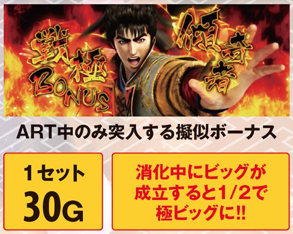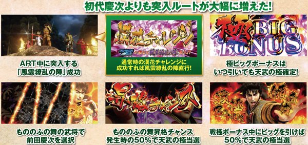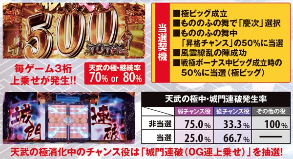 最強の上乗せ特化ゾーン・天武の極への突入ルートの一つである風雲繚乱は通常時からの発動もあるほか、前作と異なり極ビッグは状況を問わず成立した時点で天武の極が約束される。どこからでも天武の極が期待できる点も、本機の大きな特徴の一つといえるだろう。
