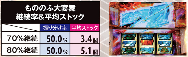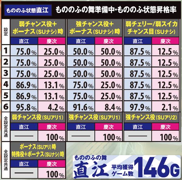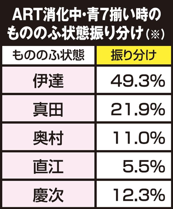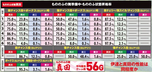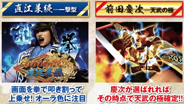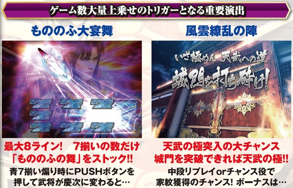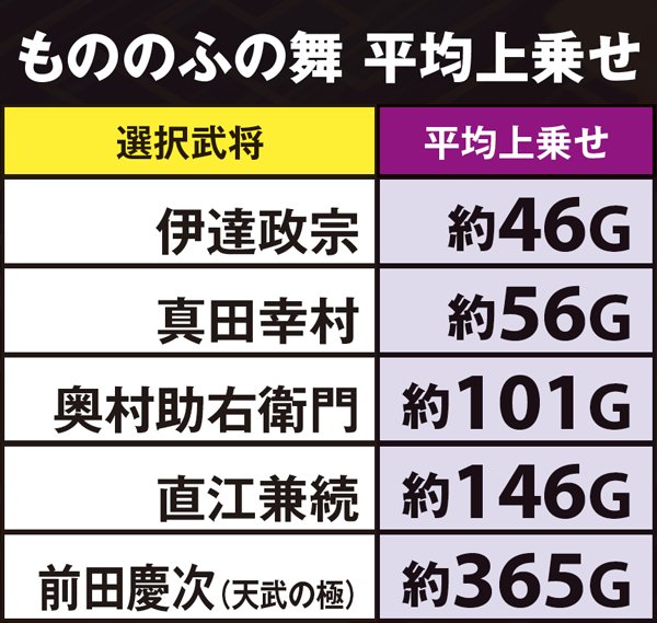 登場する可能性のある武将は全5種類で、前田慶次が選ばれれば天武の極確定。直江や奥村もそれなりに期待度が高いと思われ、消化中の上乗せ性能は各武将によって変化する。なお、もののふの舞へはセット開始時のみならず「いくさ語り」や「もののふ大宴舞」を機に突入するパターンもあり、後者は複数ストックの大チャンスだ。