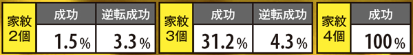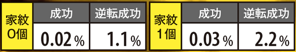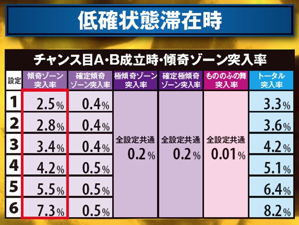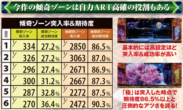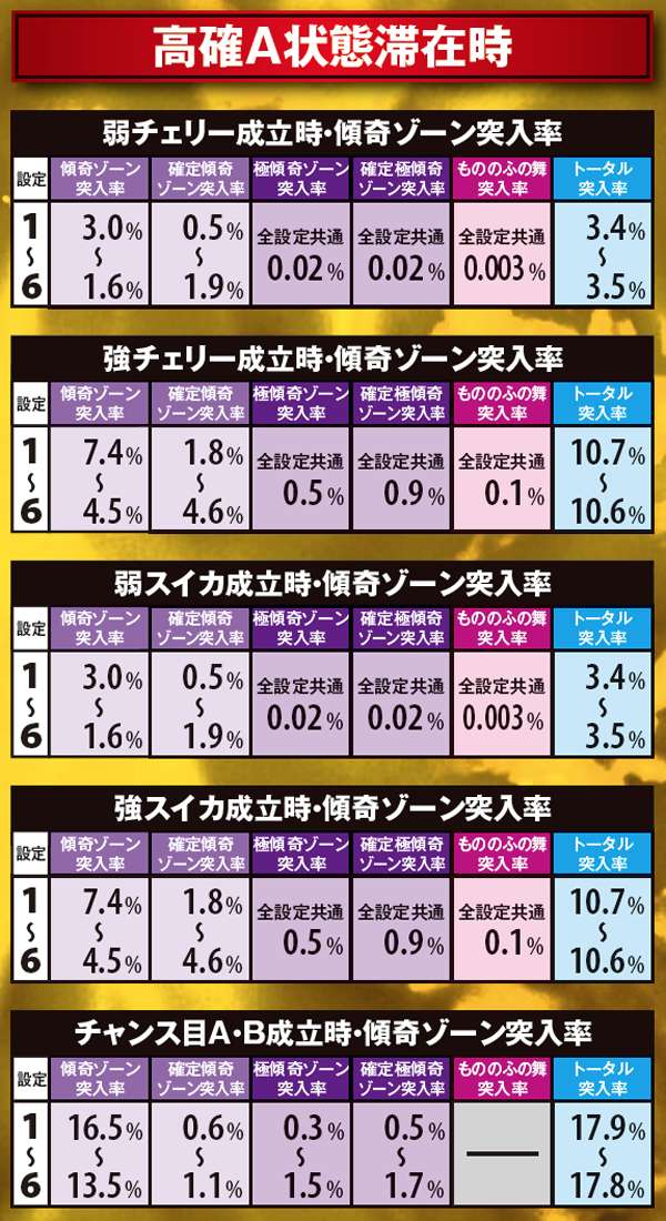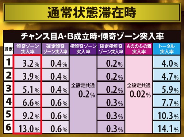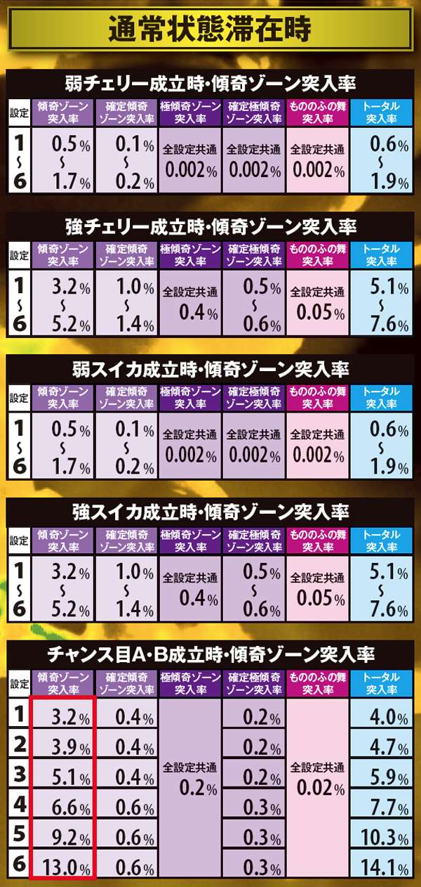 傾奇ゾーンと極傾奇ゾーンの突入率及び成功期待度は上表のとおりで、基本的には高設定ほど入りやすく、期待度も高い。極傾奇ゾーンは期待度86%超と灼熱だ。