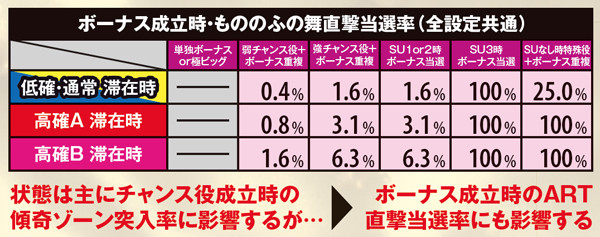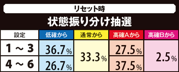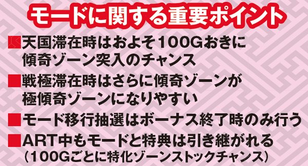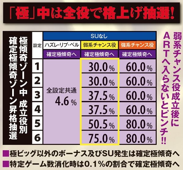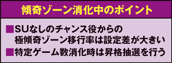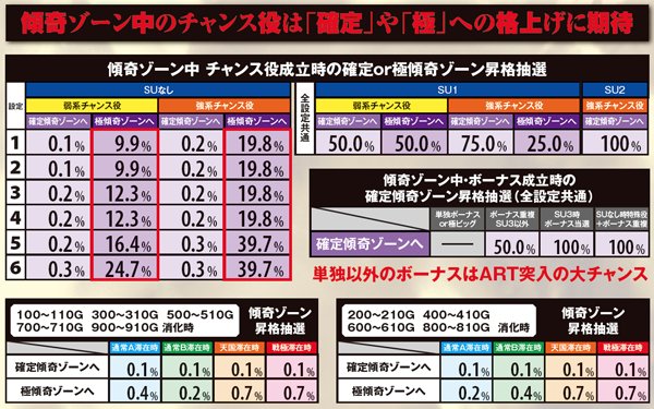 傾奇ゾーンは最初からART当選が決まっているもの(確定傾奇ゾーン)とそれ以外のものに分けることができ、後者は消化中に「極」や「確定」への昇格抽選を行っている(傾奇ゾーン中に100Gの区切り目に到達した場合も同様に昇格のチャンス)。なお極傾奇中の弱系チャンス役は設定差も大きいので注目だ。