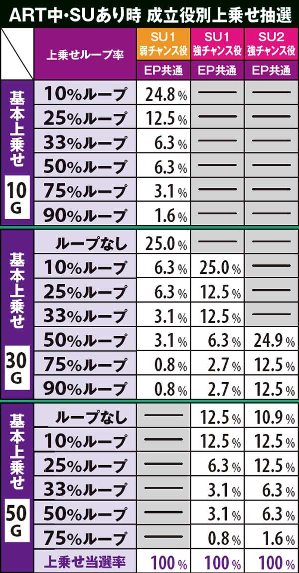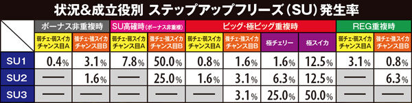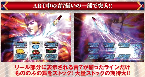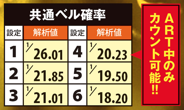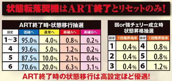 ART中にステップアップを伴ってチャンス役が成立した場合は大チャンス。特に強系役なら激アツで、その時点でループ率ありの30G以上の上乗せが確定する。