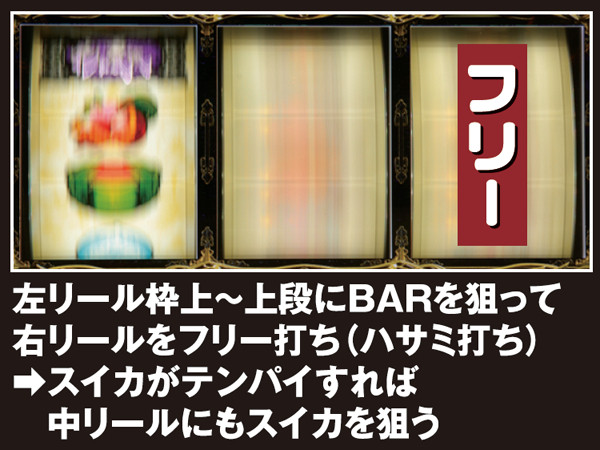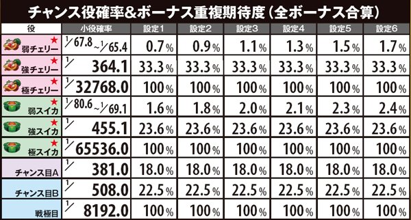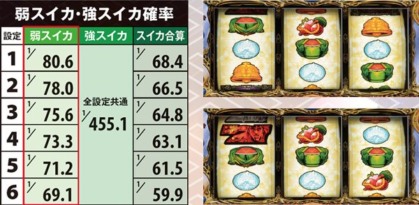 さほど大きな数値差ではないが、本機の小役で最も差の大きい部分なので弱スイカは要カウント。目押しが早いと強スイカ成立時も右下がりに揃うので、目押しに自信がなければ両スイカの合算出現率を算出して対応しよう。