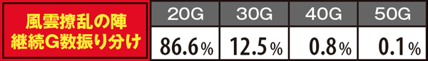 ART中のチャンス役で突入抽選を行う「風雲繚乱の陣」は、成功すれば天武の極が確定する激アツのCZ。継続ゲームは最低20Gで(最大は50G)、消化中のチャンス役や中段リプレイで家紋を集めて城門突破に挑む。四武将の家紋を全て集めれば勝利濃厚だ。なお、通常時の漢花チャレンジ成功からも風雲繚乱の陣に突入する。