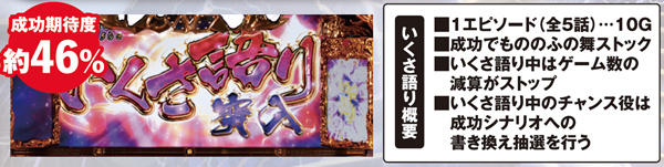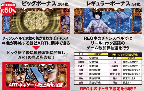 本機はエピソード進行型のARTとなっており、「いくさ語り」から発展する連続演出をクリアするたびにストーリーが進行。最終話である第5話はエンディング中に上乗せ特化ゾーンとなるので、一粒で2度美味しい。