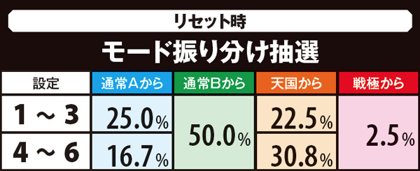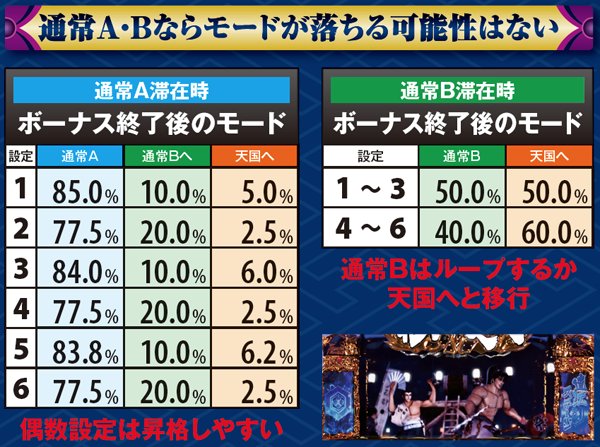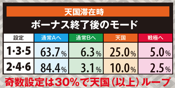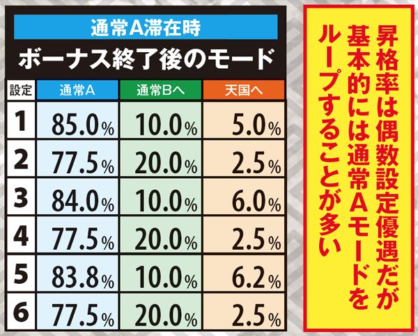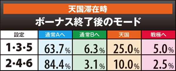 表を見てのとおり基本的には通常Aをループすることが多く、トータルの天国滞在比率はさほど高くない。そのため毎回ボーナス後100G回すべきかどうかの判断は難しいところだが、100G消化で傾奇ゾーンに入った場合は次のゾーンまで様子を見るのも悪くないだろう。