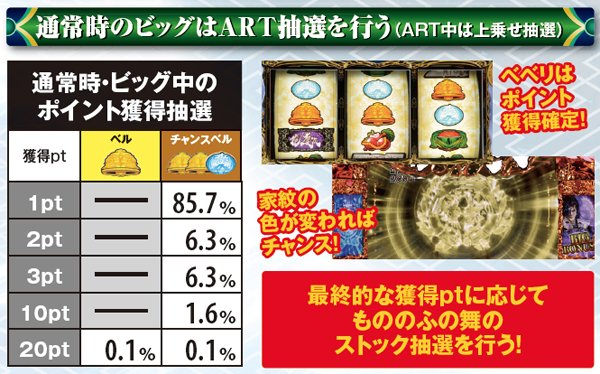 ボーナス中に重要なのはチャンスベル。ビッグはチャンスベル成立時の累計獲得ポイントをもとにART抽選を行い、REGではリールロック高確の継続ゲーム数加算抽選を行う。
