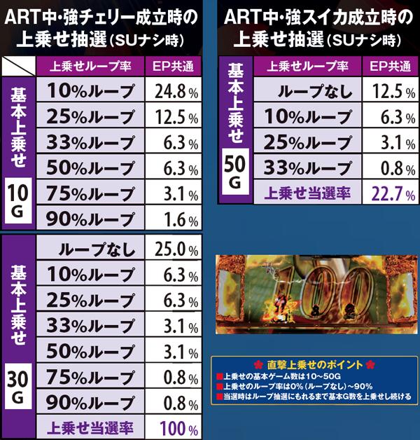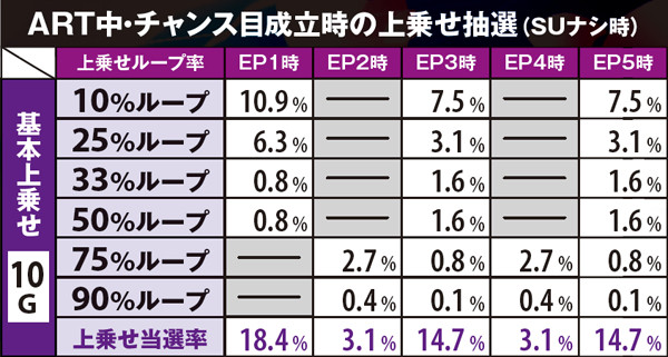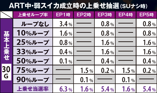 ART中に弱チェリー、弱スイカ、及び両チャンス目を引いた場合は、滞在エピソードによって上乗せ抽選の値が変わってくる。具体的には奇数エピソード滞在時には上乗せ率は高いものの小さいゲーム数が選ばれやすく、偶数エピソードはその逆の傾向がある。