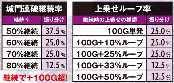 城門連覇発生時は、まず継続率に応じて上乗せか終了かを抽選。上乗せとなった場合は最低でも100Gの上乗せが確定し、さらにループ率がついてきた場合は抽選にもれるまで100G上乗せをし続ける。ループにもれたら、再度継続抽選に戻る仕組みだ。