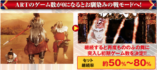 本機のARTは初代と同じくセット数継続タイプ。初当り時および継続時には「もののふの舞」で初期ゲーム数を決定し、残りゲーム数がある間は主にチャンス役でゲーム数の直乗せ&上乗せ特化ゾーンの抽選を行う。継続率は最低でも50%。