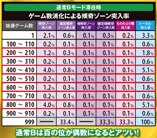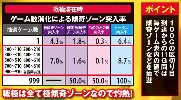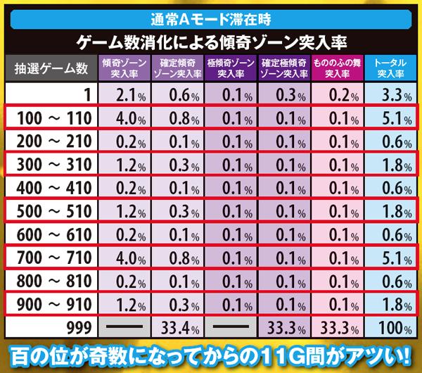 100Gの区切り目到達後は11Gに渡り、毎ゲーム上表の値で傾奇ゾーンの突入抽選を行う。1ゲームの当選率は数%でも、11G消化した際の期待度はなかなかのものだ。