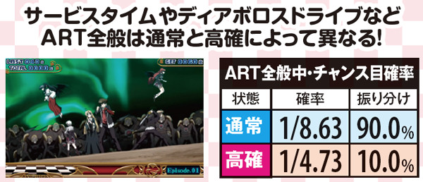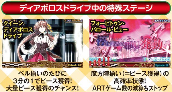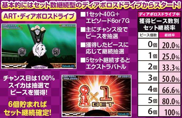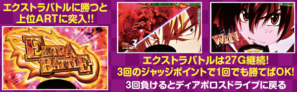 基本となるART「ディアボロスドライブ」は1セット40Gのエピソード継続タイプ。消化中にピースを獲得するほど継続期待度が上がり、主に5セット継続で発生する「エクストラバトル」に勝利すれば上位ARTに昇格する。