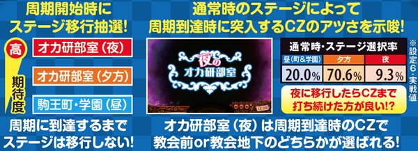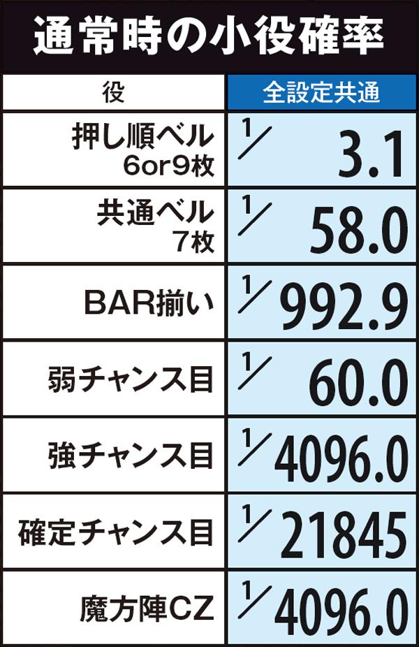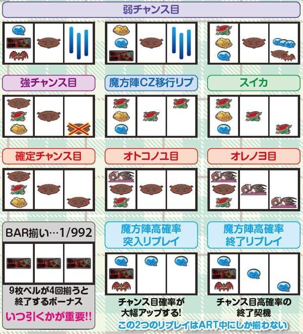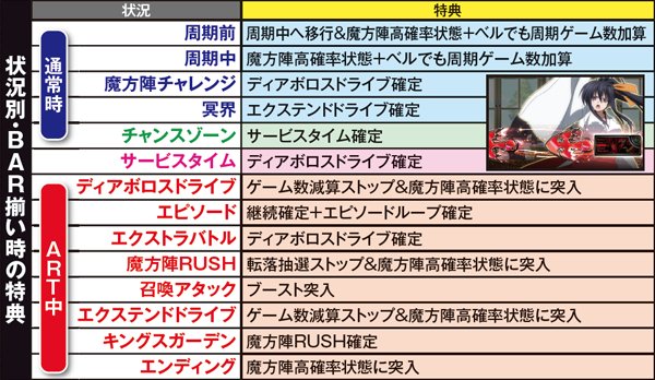 魔方陣ラッシュ準備中は、魔方陣ラッシュ中の魔方陣揃い保証回数上乗せ抽選を行っており、スイカは10%で、弱チャンス目は50%で1回上乗せできる。強チャンス目は80%で1回、20%で3回、魔方陣揃いは3回確定だ。また、ディアボロスドライブ終了待機中はチャンス役で復活抽選。スイカ&弱チャンス目の期待度は低いが、強チャンス目を引ければ50%で復帰する。