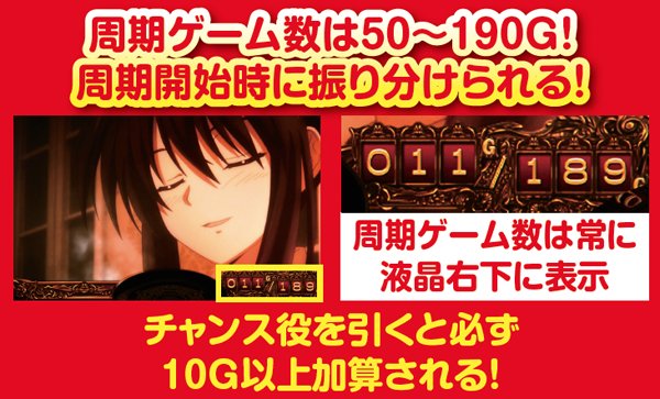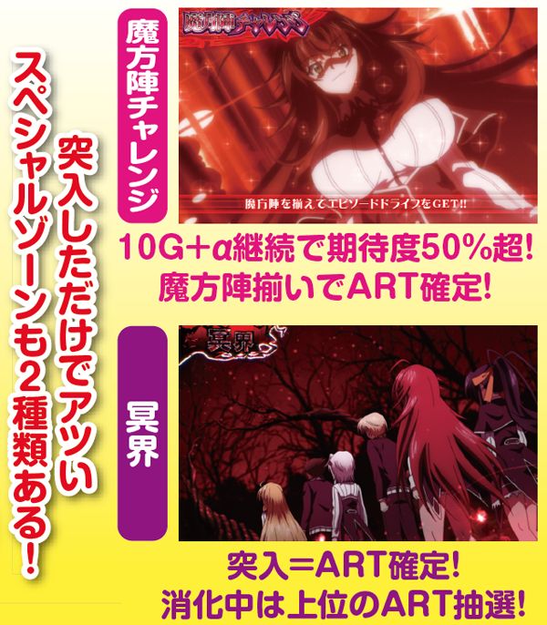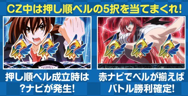 原作のみならずTVアニメも大ヒットを記録した人気コンテンツが、KPEの手によりパチスロへと変貌を遂げた。ファンが待ち望んだそのタイトルの名は『ハイスクールD×D』。専用筐体が目を引く、1Gあたり純増約2枚のARTマシンである。 ARTはセット継続型と上乗せ型の2種類があり、基本的には前者からスタート。消化中に条件を満たせば後者へ突入し、その際は平均350Gの上乗せが見込める。 |