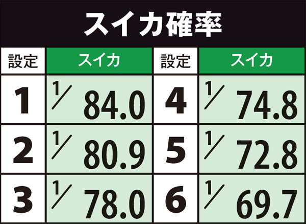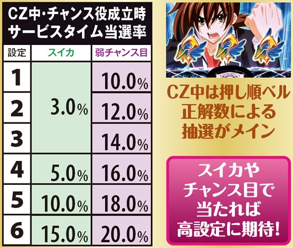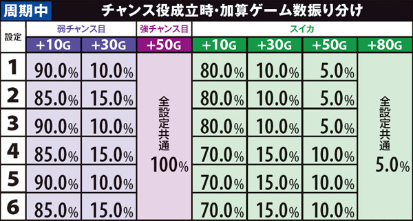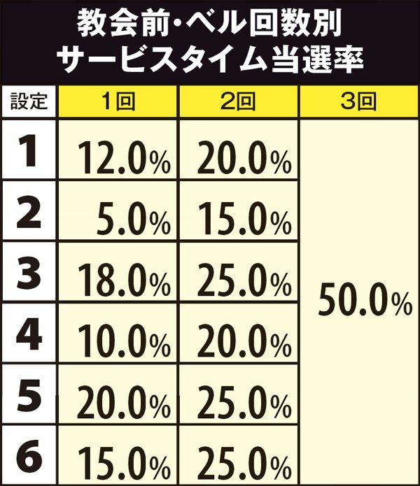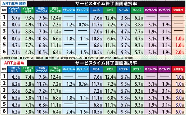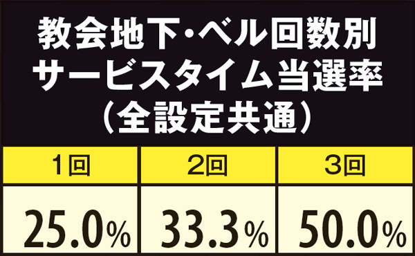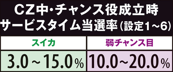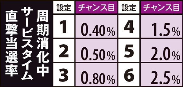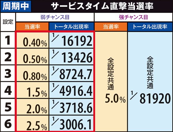 チャンス目成立時はサービスタイム直撃抽選が行われており、弱チャンス目に関しては上表の通り設定差がある(高設定ほど当選率アップ)。強チャンス目からの直撃は設定差がなくトータル出現率が低いので、弱チャンス目からの直撃の有無をチェックしておこう。