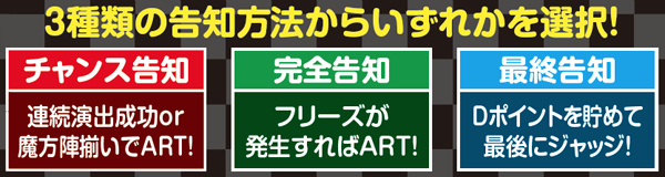 サービスタイムは3種類のタイプを選択可能。最終告知を選ぶと消化中のベルやチャンス役でDポイントを獲得…最後にそのポイントを使ってPUSH連打となる。完全告知はフリーズ発生、チャンス告知は魔方陣揃いor演出成功でARTだ。