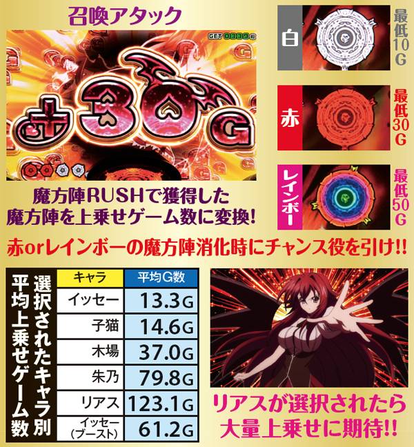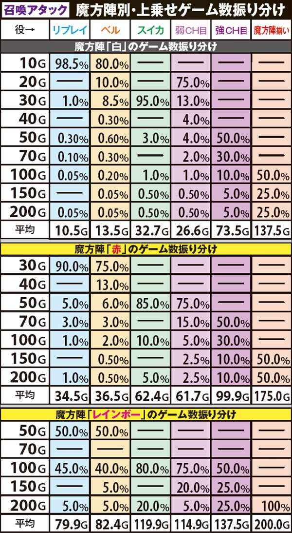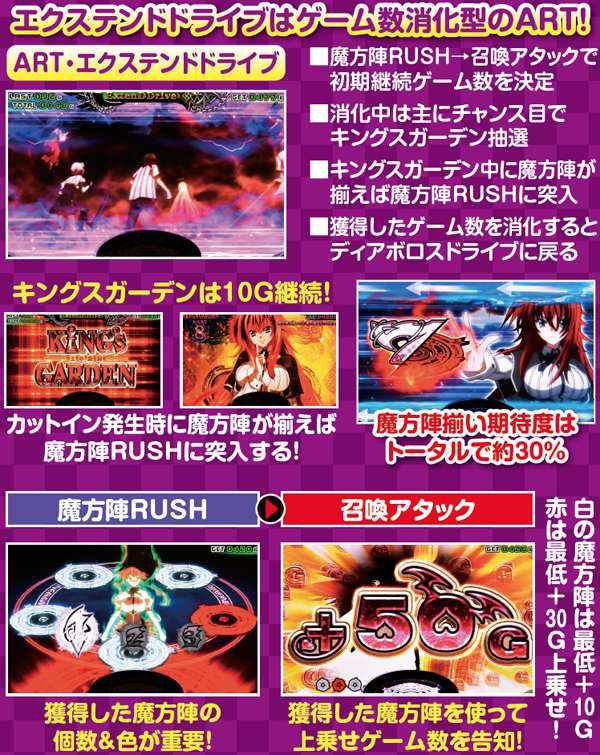 上位ART「エクステンドドライブ」ではまず「魔方陣RUSH」で魔方陣をストックし、その後の「召還アタック」で魔方陣を上乗せゲーム数に変換する。ゲーム数は魔方陣の色で示唆され、白なら10G以上、赤は30G以上。レインボーなら…。