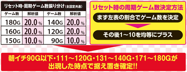 朝イチは周期開始時の周期ゲーム数をチェック。リセットでは選ばれない上記のゲーム数が出現したら据え置きが確定する。設定上げ狙いや据え置き狙いなど、状況に応じて打ち続けるか即ヤメか判断しよう。