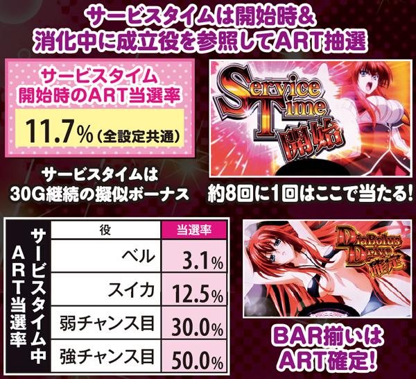 サービスタイムは、言わば出玉獲得の入口。ここでディアボロスドライブを射止められるかどうかが鍵を握る(当選率は50%以上)。当否の決定は成立役ごとの抽選なので、ここでチャンス役を引けるかどうかがポイントだ。