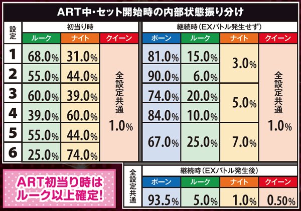 ディアボロス中の内部状態はポーン、ルーク、ナイト、クイーンの4種類で、セット開始時に振り分け抽選が行われる。設定差はあるが、残念ながらクイーン以外の状態を見分けるのは難しい。