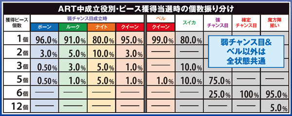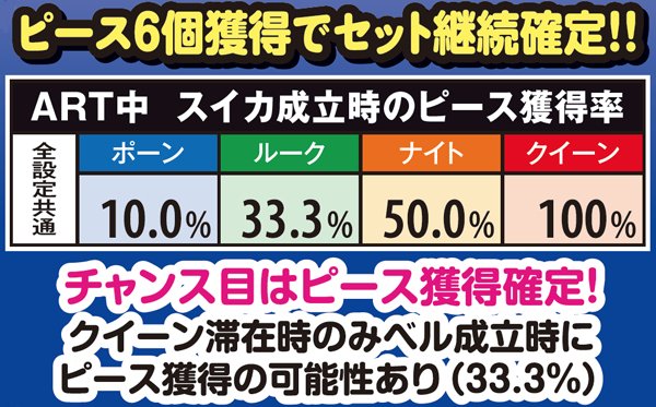 ピース6個で次セットへの継続確定となるわけだが、スイカ時のピース獲得率は上位状態になるほどアップ、弱チャンス目時のピース獲得数はポーン<ルーク<ナイトの順に期待度がアップする。そこまでの大差ではないが、滞在状態のチェックはある程度可能だ。