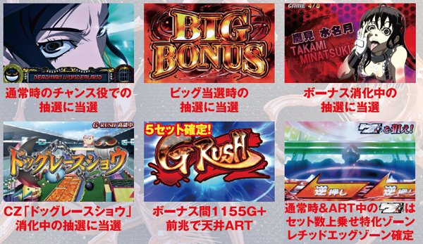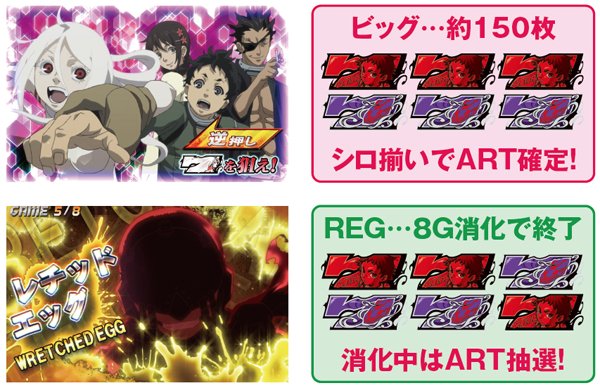 漫画だけでなく、TVアニメも大人気だった「デッドマン・ワンダーランド」が待望のパチスロ化。 ボーナス+ARTマシンとなっており、レチッドエッグゾーンでのG-RUSHセット数ストック&G-RUSHクロウ&オウルで貯めた上乗せゲーム数を一旦ストックするART新ストック機能「Gストックシステム」が最大のウリとなっている。 |