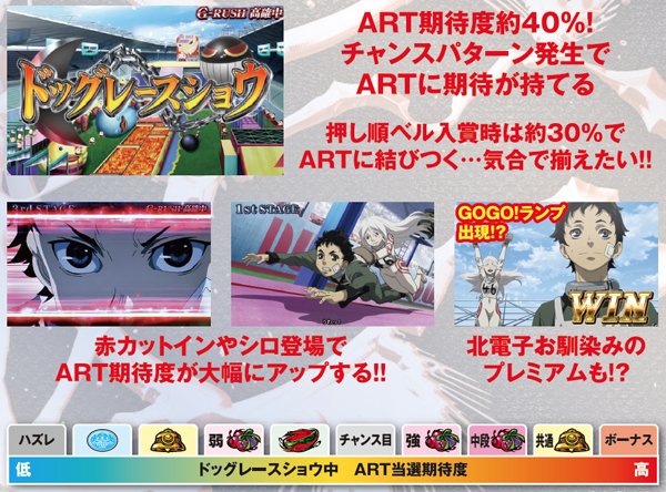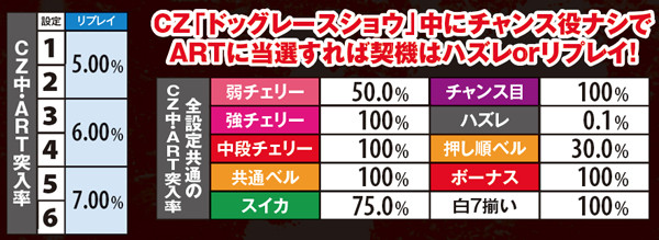 通常時に突入するCZ「ドッグレースショウ」消化中は、ART自力当選の大チャンス。毎ゲーム全ての役で突入抽選を行い、トータル期待度は約40%となっている。チャンスアップパターンも豊富に用意されているため、出目と液晶に注目だ。