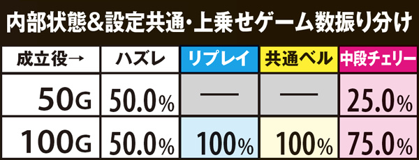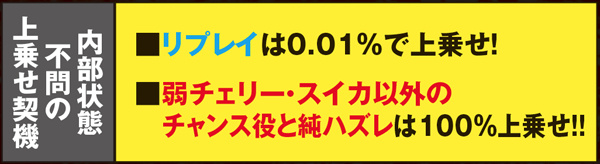 ART中も内部状態があり、弱チェリーとスイカのみ、それを参照して上乗せ抽選を行う。超高確に移行すれば、チャンス役=上乗せだ。