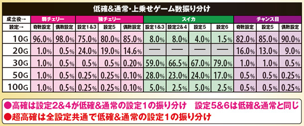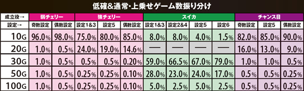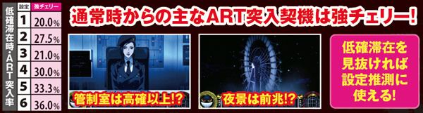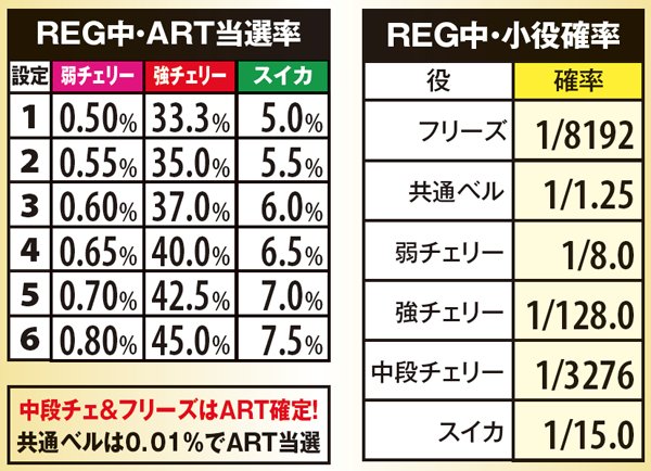 通常時は全てのチャンス役でART抽選を行っているが、主軸となるのは強チェリー。低確状態でも20~36%の割合でARTに当選する。