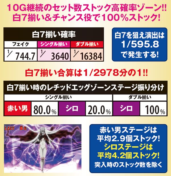 通常時からの突入もあり、消化中の白7揃い時はシングル揃いなら1個以上ストック、ダブルは2個以上+シロステージ確定だ。