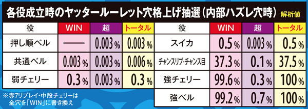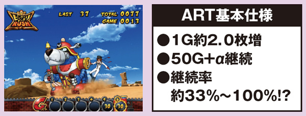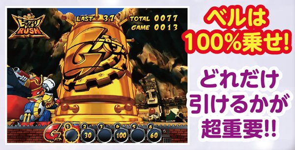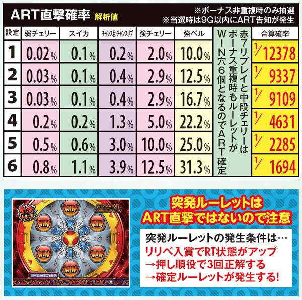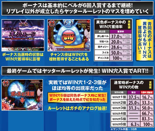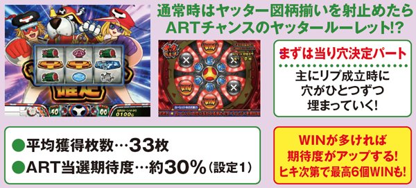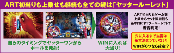 ARTは継続ルーレット時のWIN穴数でいわゆる「継続率」が決められるが、超ビックリドッキリRUSH時は必ずWIN穴が5個以上となる。それが確定+αのヤッターボーナスは既存機屈指の破壊力だ。