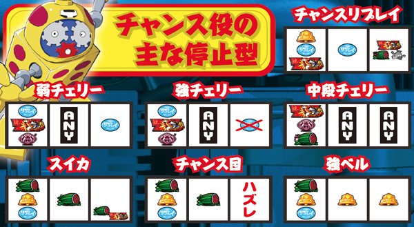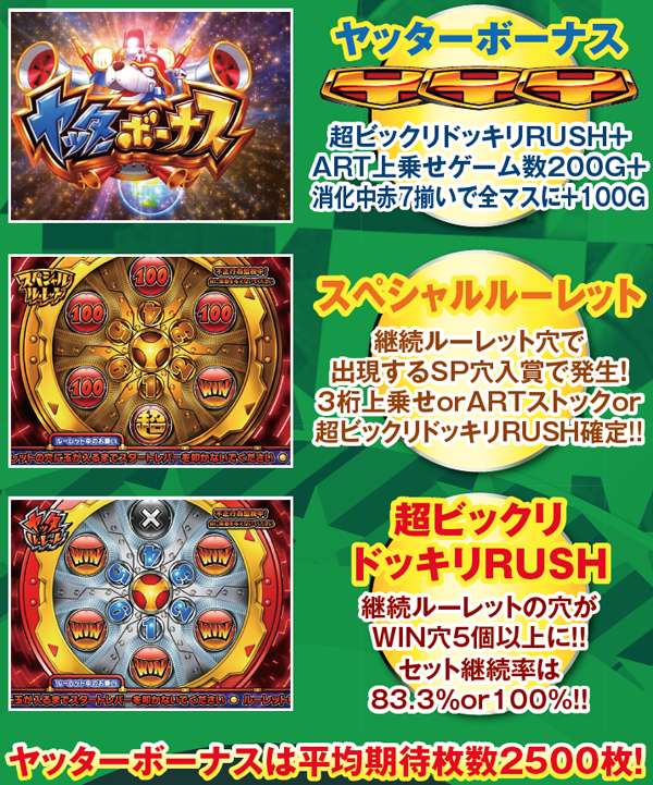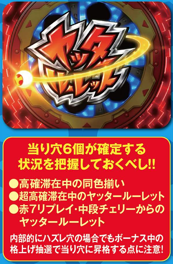 | 機種概要 | 本機は役物ルーレットが随所で活躍する斬新なゲーム性を有しており、まず高確率で当選するボーナス中は成立役に応じてルーレットのマスを埋める→最終ゲームのヤッタールーレットでWIN穴入賞でART確定。ART中は1G毎に移動する6個のカーソルにGパワーをチャージ→チャージがあればラストで上乗せルーレット発生→ルーレット成功でGパワー分のゲーム数が上乗せされ、失敗時はセット継続をかけた継続ルーレットが発生。 |