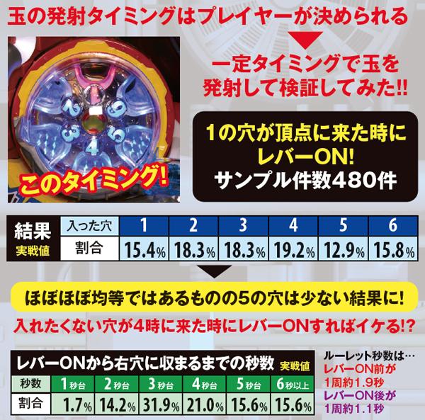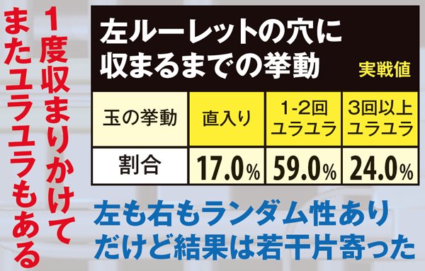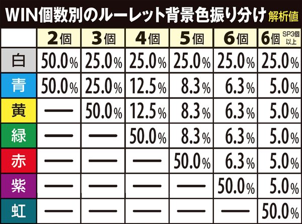 継続ルーレット時のWIN穴数はルーレットの色で示唆され、黄であれば3個以上、緑であれば4個以上が確定。虹は全穴WINに加えて、3桁上乗せや超ビックリドッキリRUSHに期待できる「SP穴」3個以上が約束される。