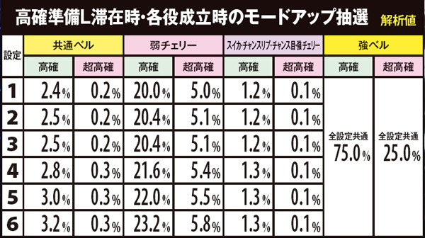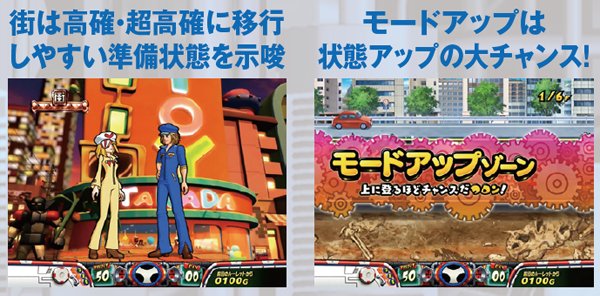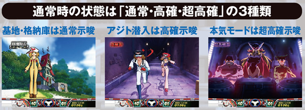通常時のステージは内部状態を示唆。アジト潜入は高確、本気モードは超高確滞在が濃厚なので、ここでボーナスを引ければART当選の大チャンスを迎える。なお、モードアップゾーン中はチャンス役成立で文字通り状態アップの期待大だ。
